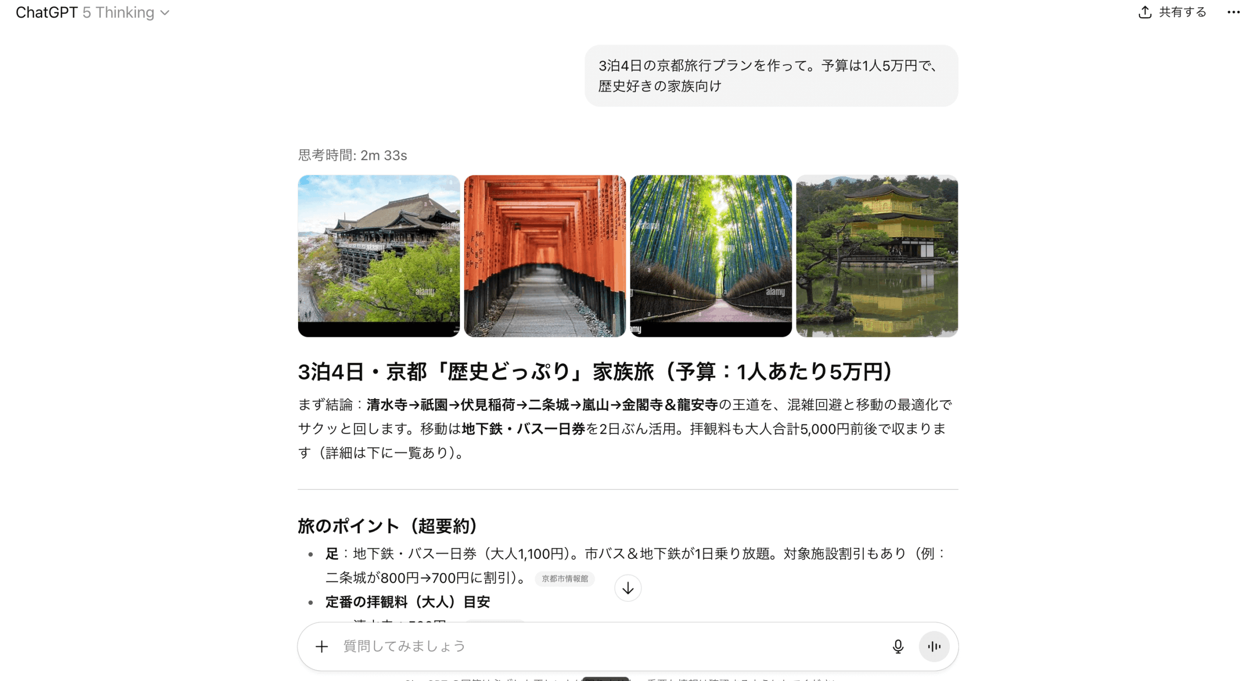 「3泊4日の京都旅行プランを作って。予算は1人5万円で、 歴史好きの家族向け」