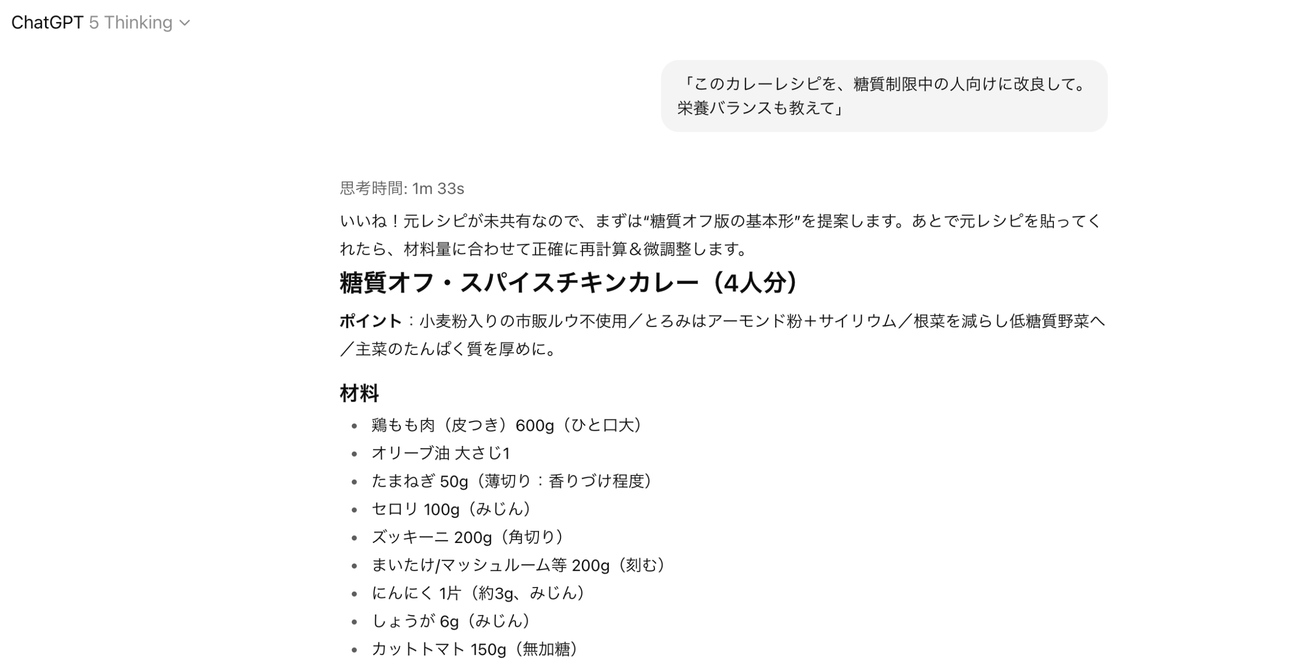 また、栄養のバランスなども条件に加えると、その情報を踏まえて結果を提示してくれるので、人間よりもかなり高い精度のレスポンスを返してくれます