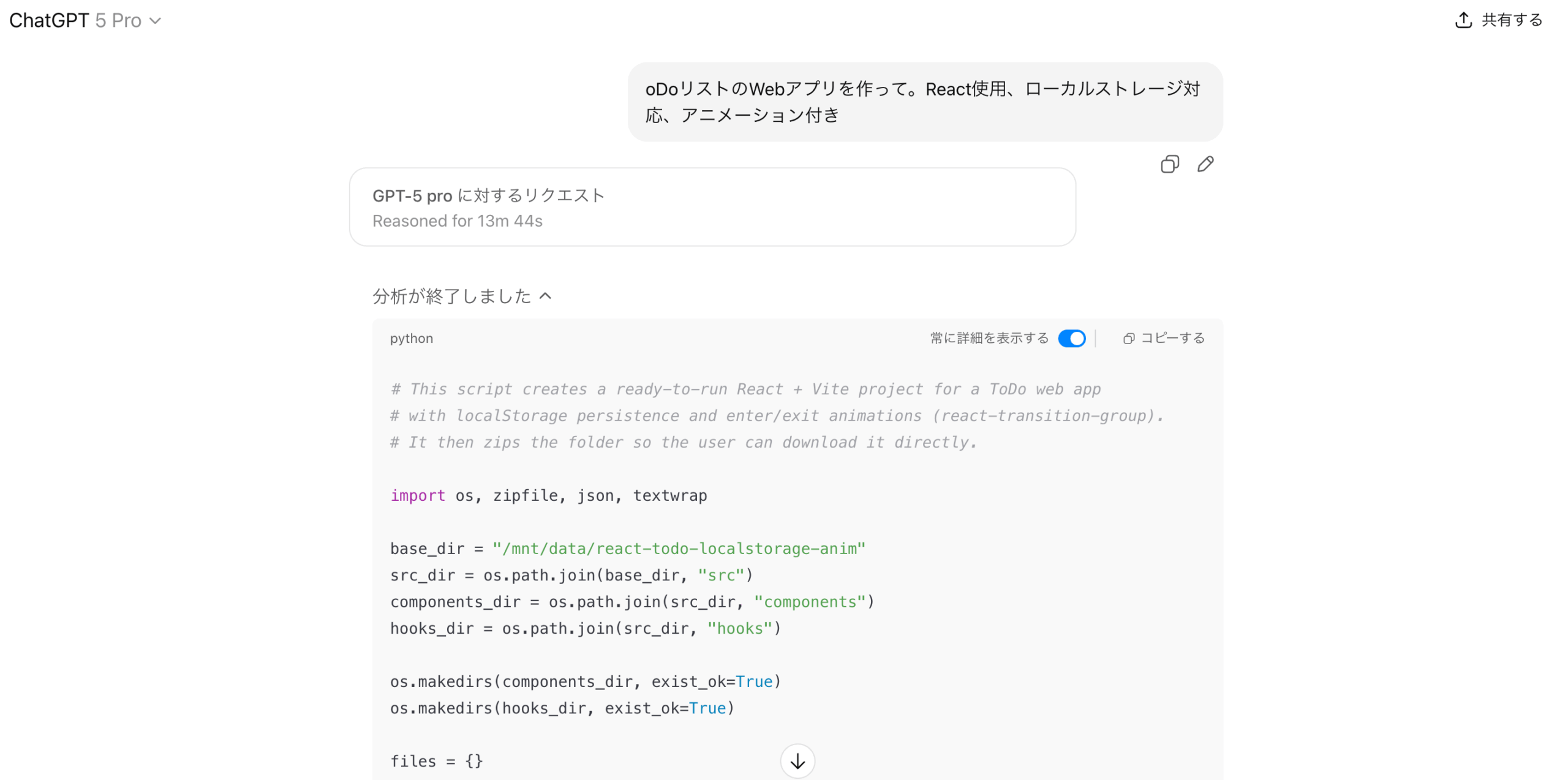 プログラムに関しては問題なく提示してくれますが、少し面倒くさいのが生成されたコードをエディターGPT-5に貼り付けて実行していく作業になります。