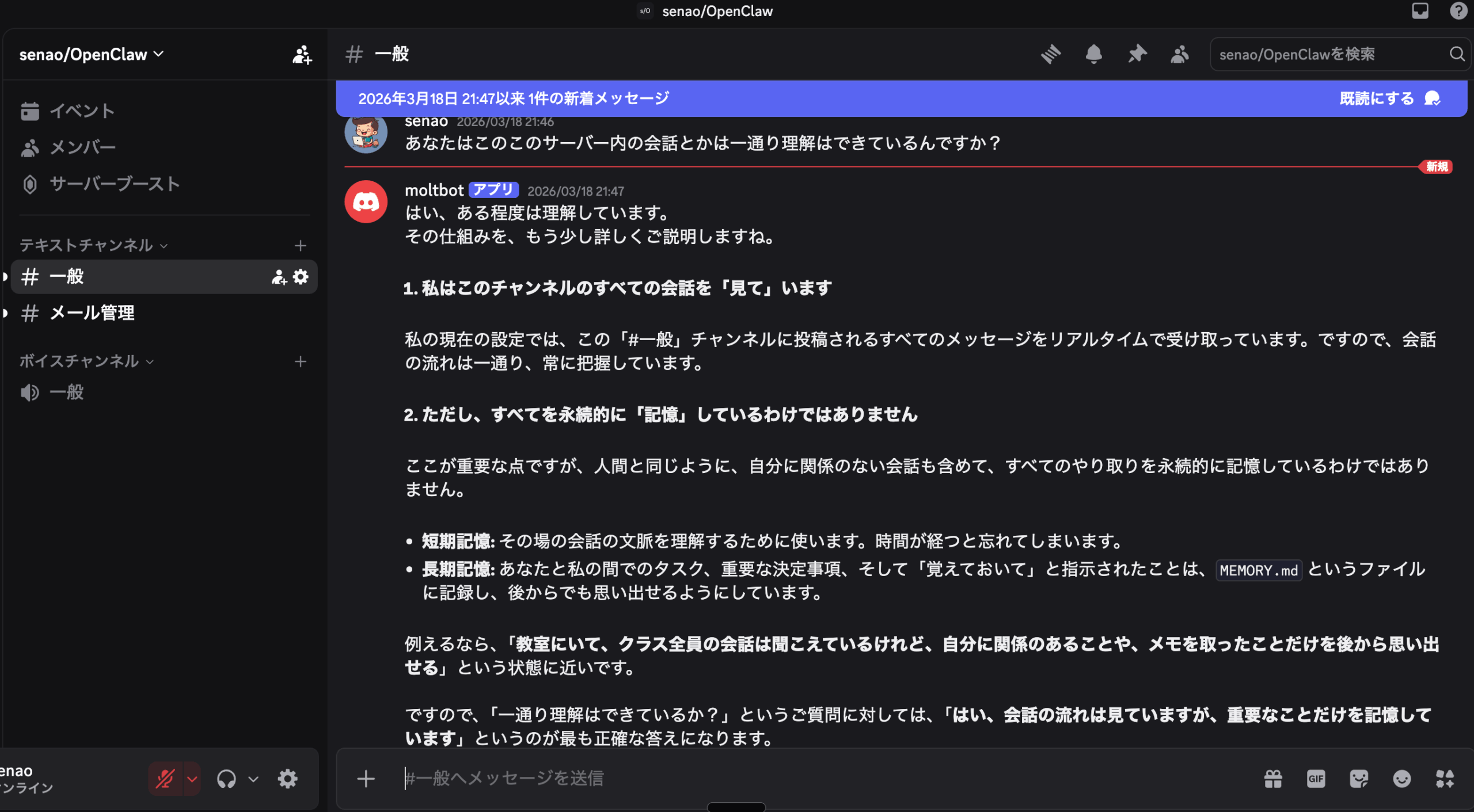 これでOpenClawとDiscordの連携は完了です。Discordのチャットからメッセージを送ると、OpenClawがあなたのパソコン上でタスクを処理してくれるようになります。