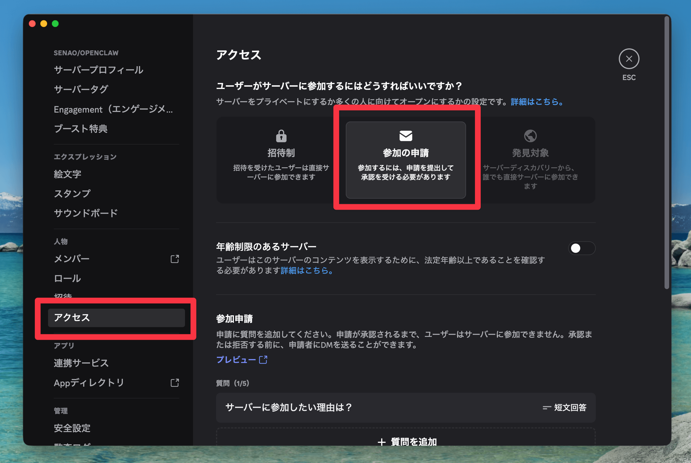 - サーバーに他人を招待しない:OpenClawがいるサーバーは自分専用にする