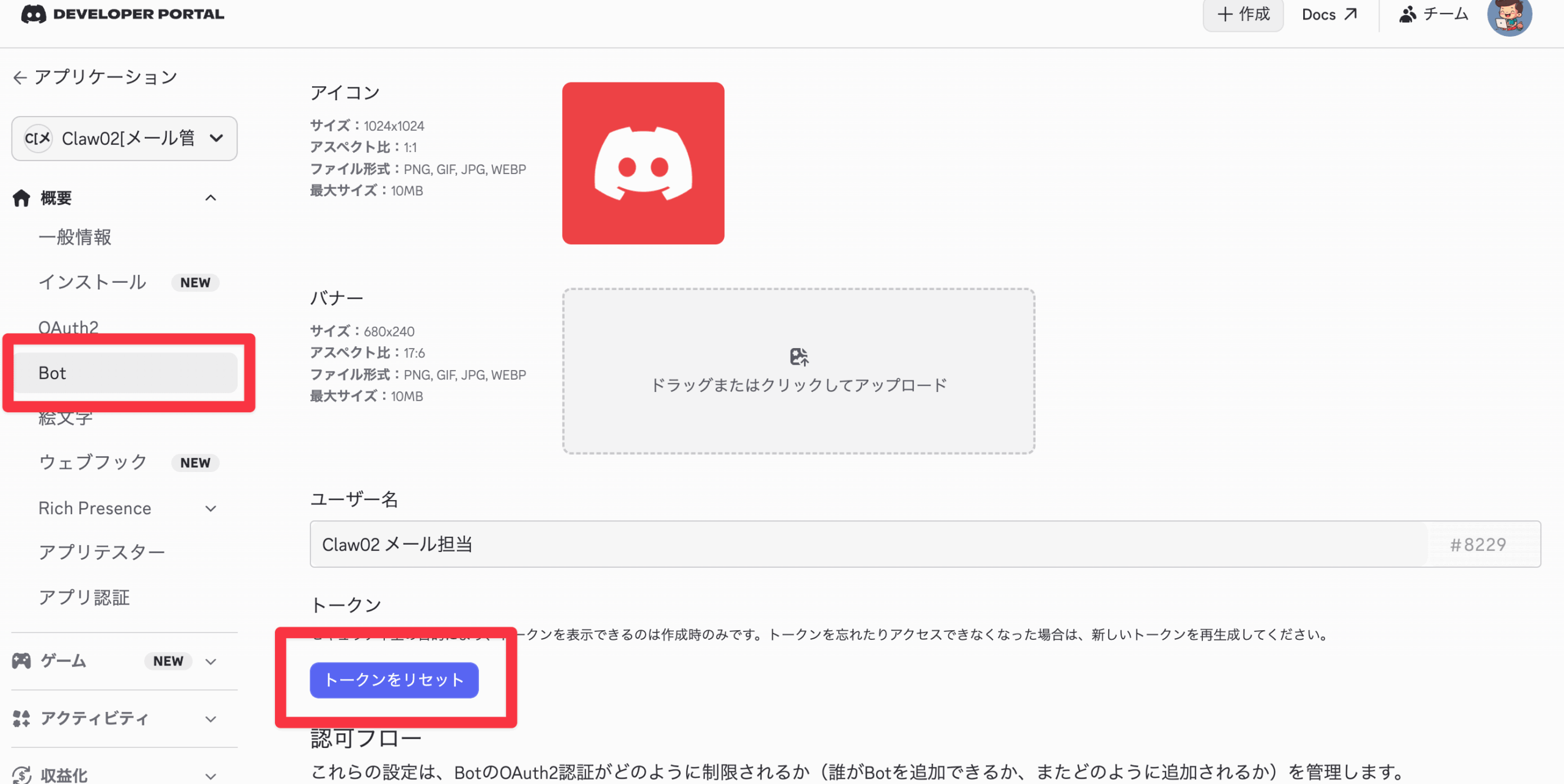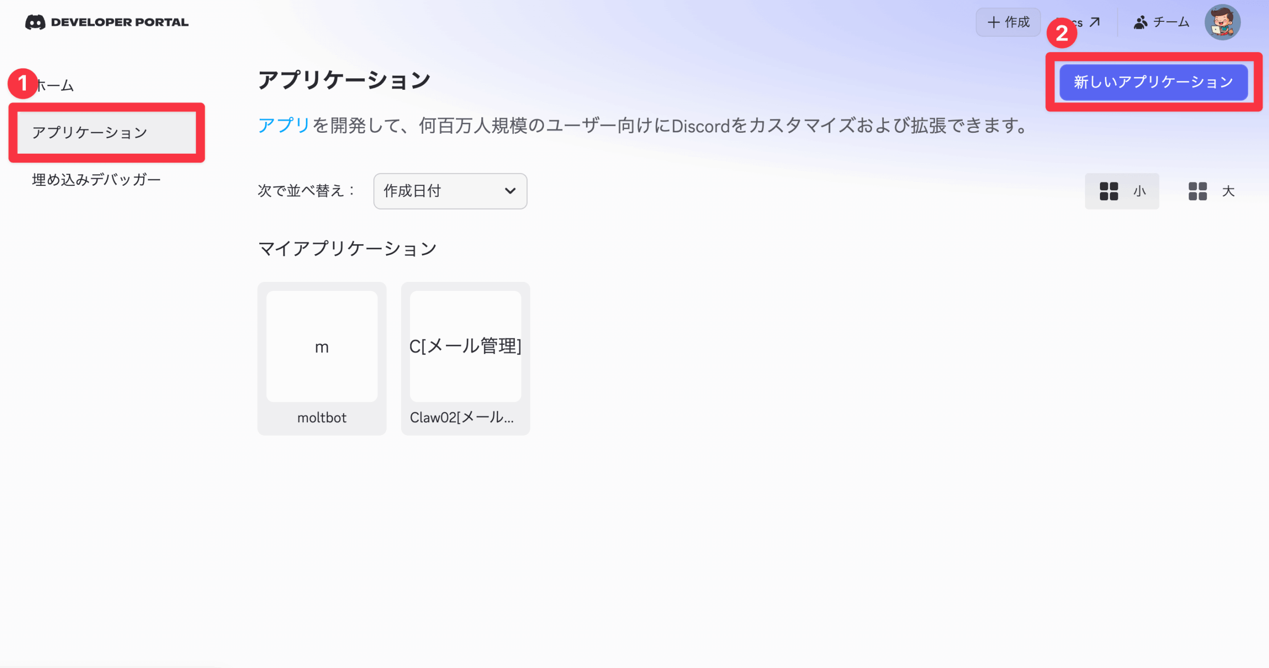 ここからが今回の重要なパートです。Discord Developer PortalでBotを作成し、OpenClawと連携させます。
