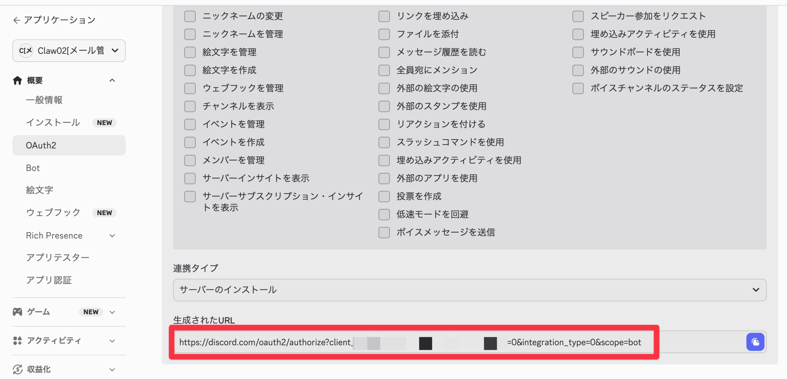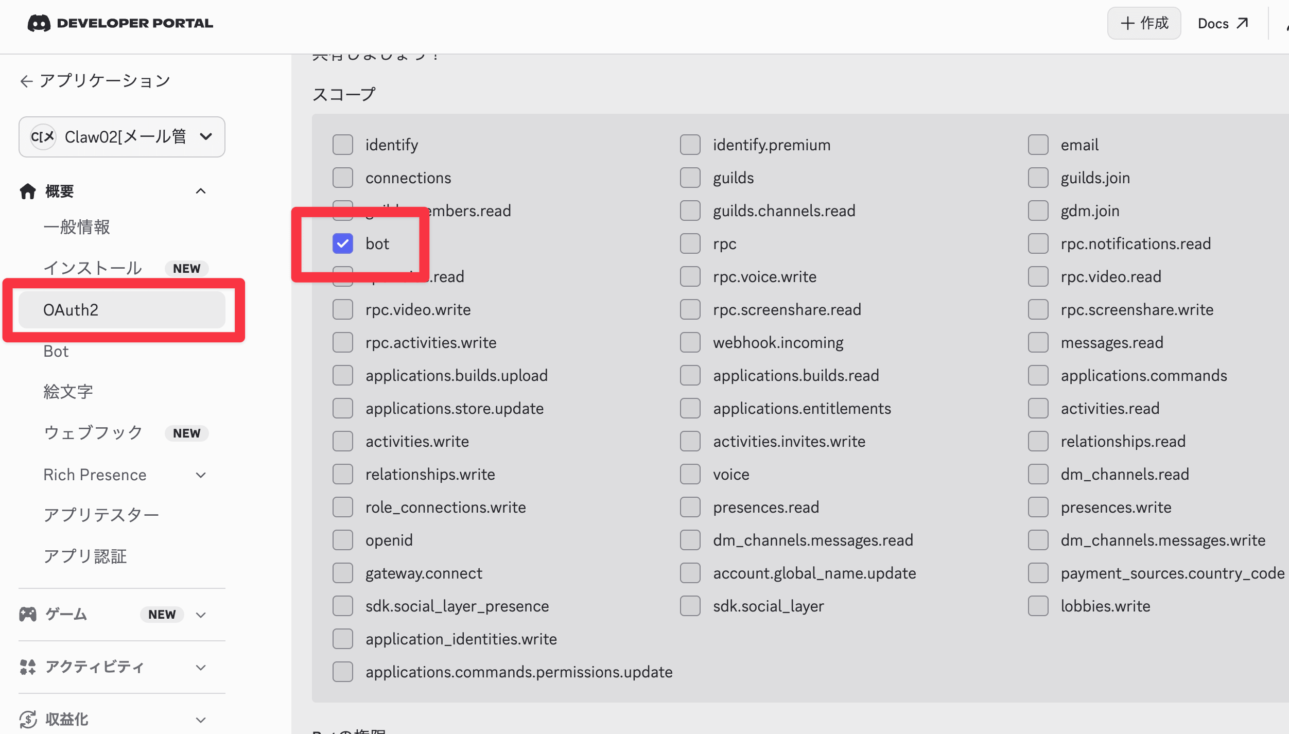 左サイドメニューの「OAuth2」をクリックし、「SCOPES」で「bot」にチェックを入れます。その下の「BOT PERMISSIONS」で必要な権限を設定してください。