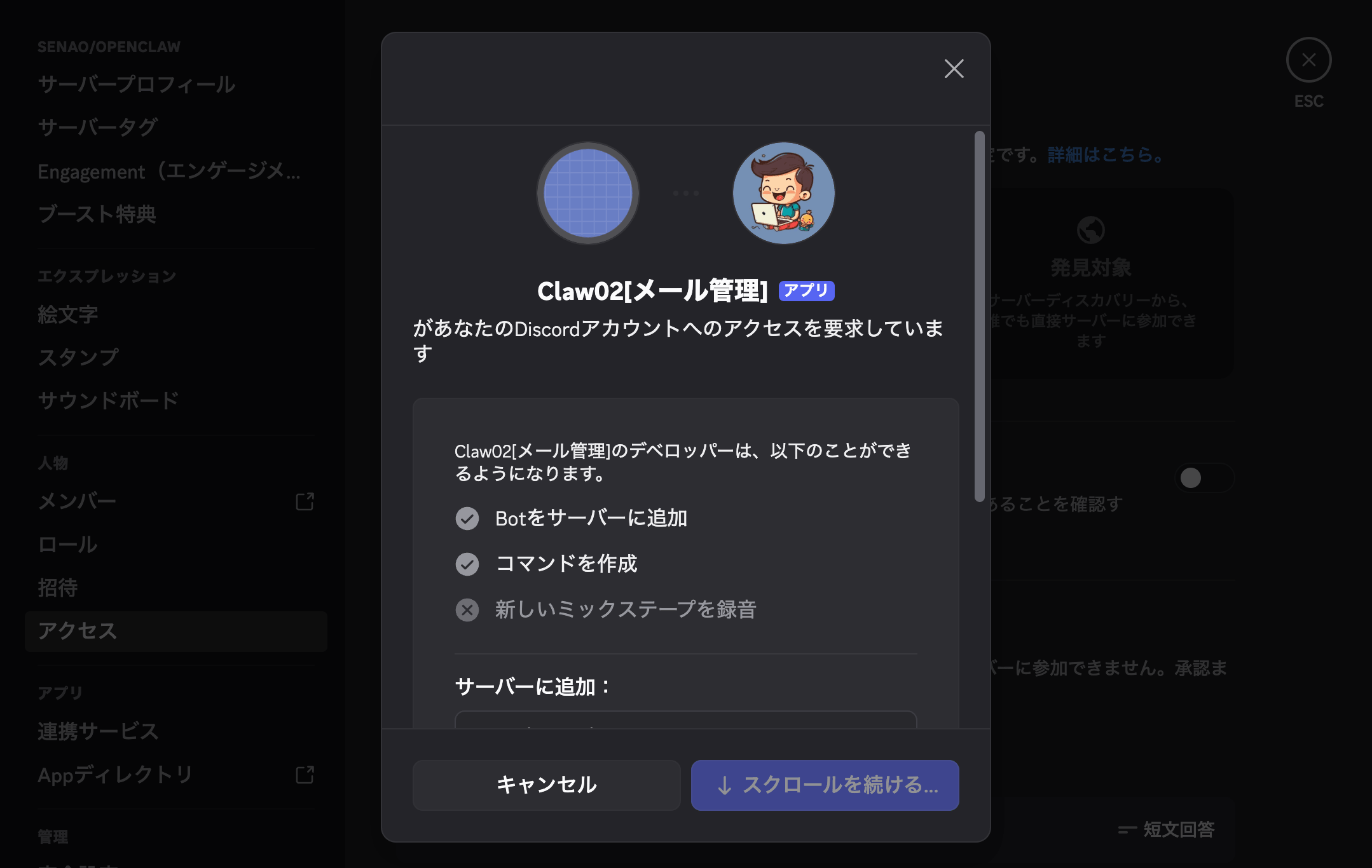 URLを開くと、Botを招待するサーバーの選択画面が表示されます。先ほど作成したサーバーを選択し、認証を完了してください。