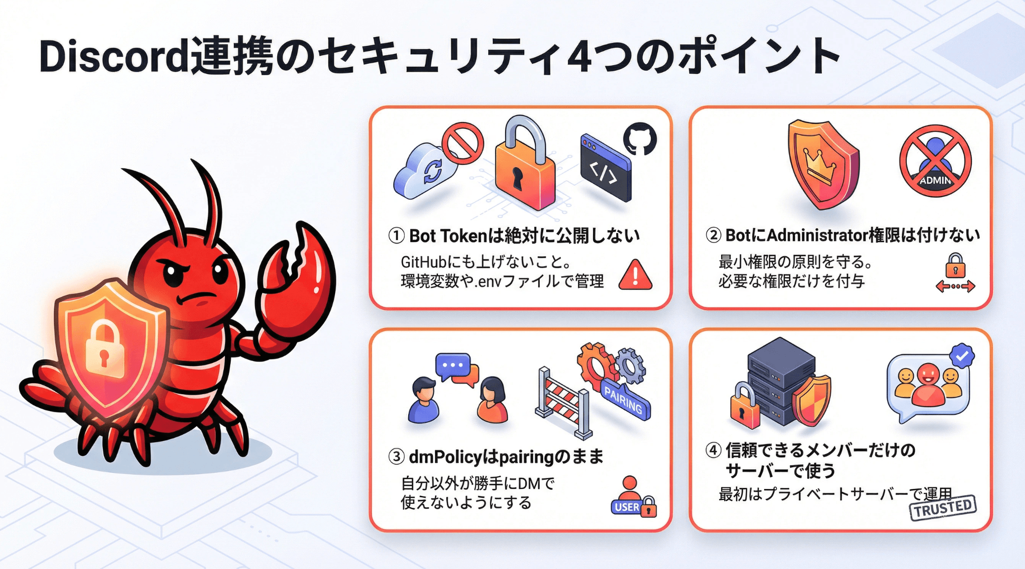 - セキュリティ対策として、Botトークンの管理と最小限の権限設定が重要