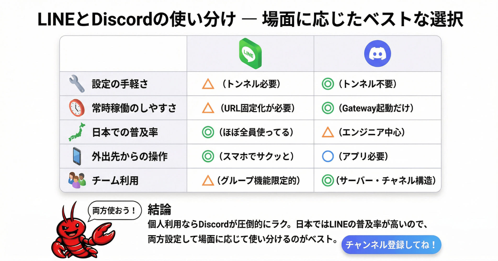LINEとDiscord、どちらもOpenClawと連携できますが、それぞれ向いている用途が異なります。