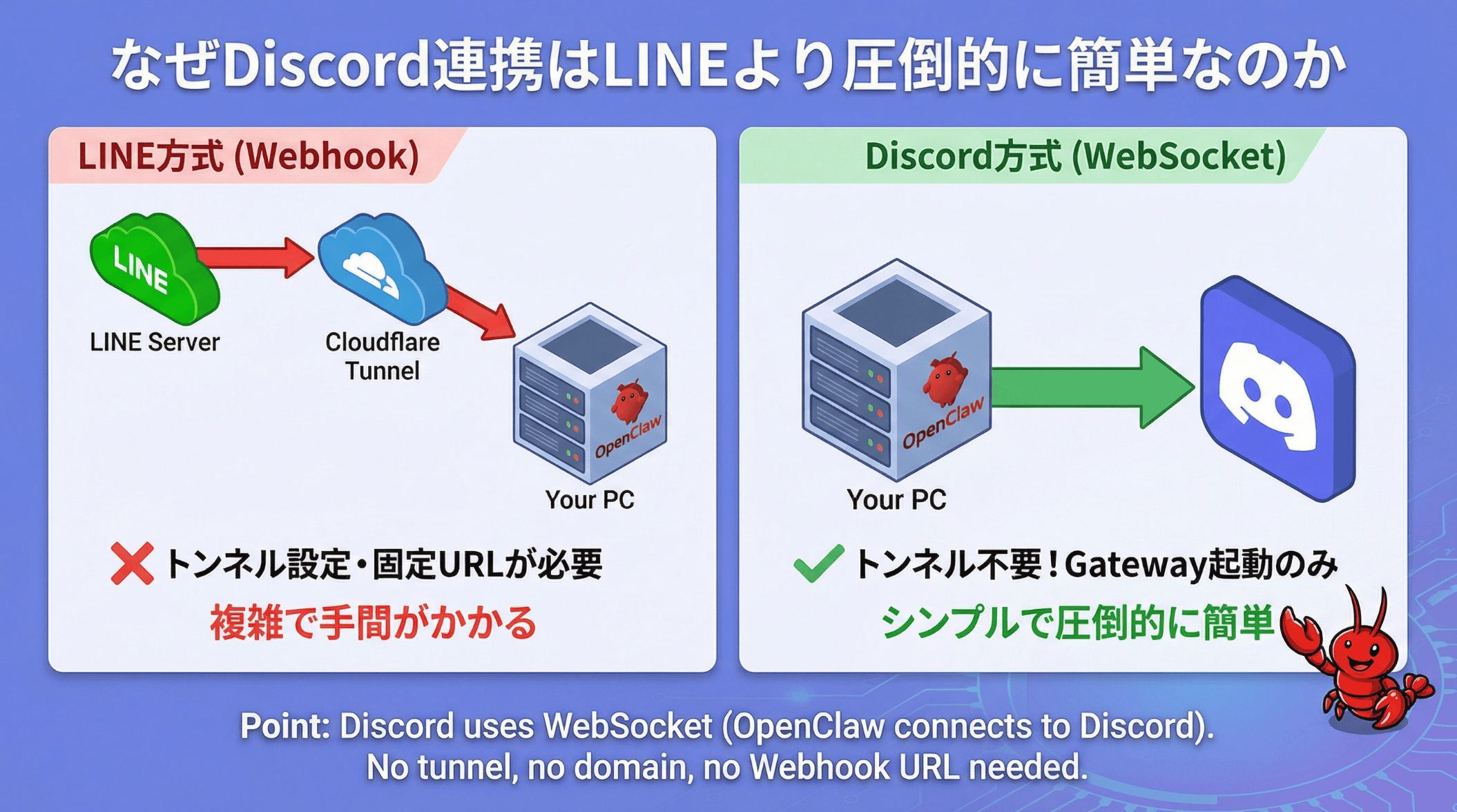 - Discord連携はWebSocket方式のため、Cloudflare Tunnelが不要でLINEより簡単