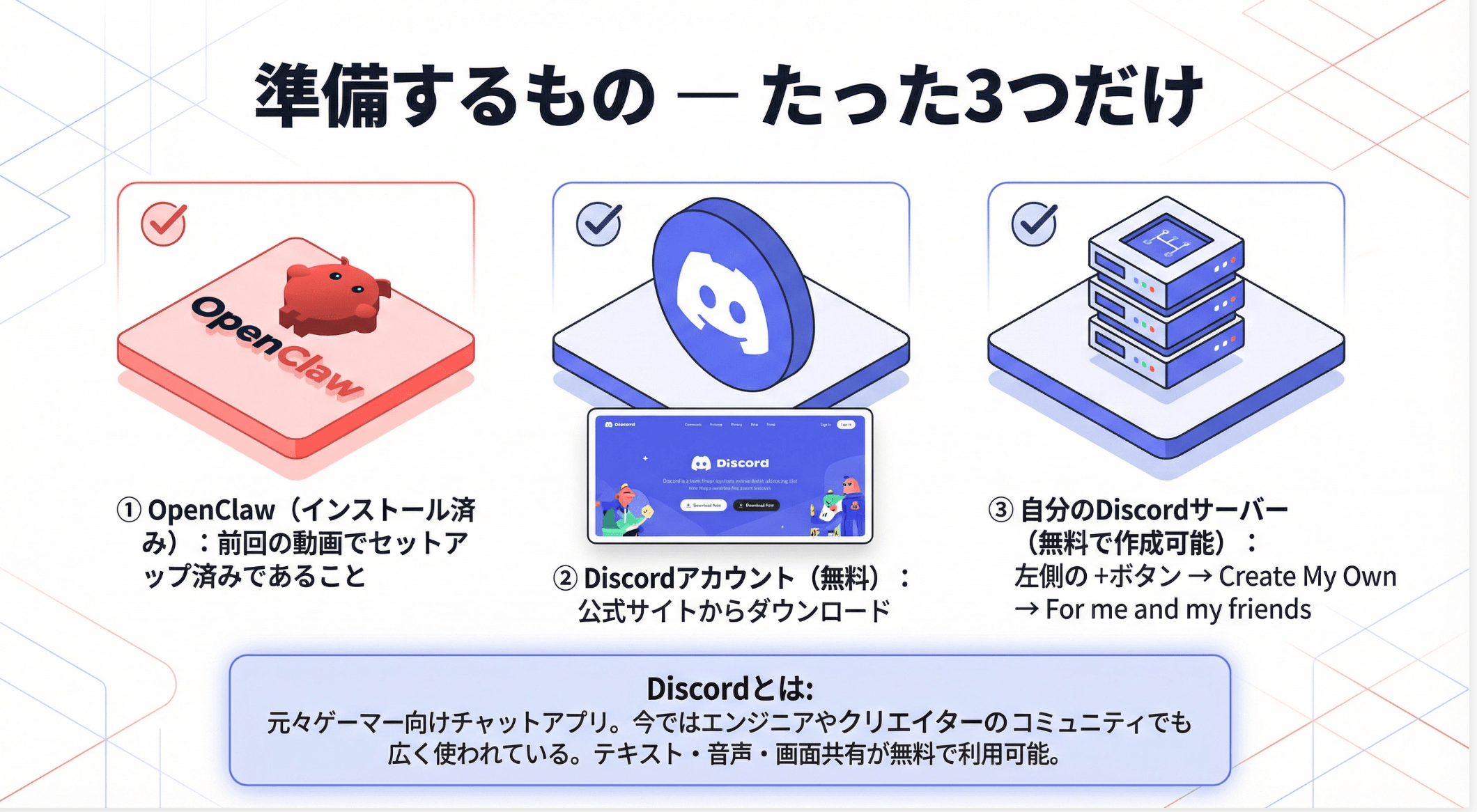 OpenClawとDiscordを連携させるために、以下の3つが必要です。