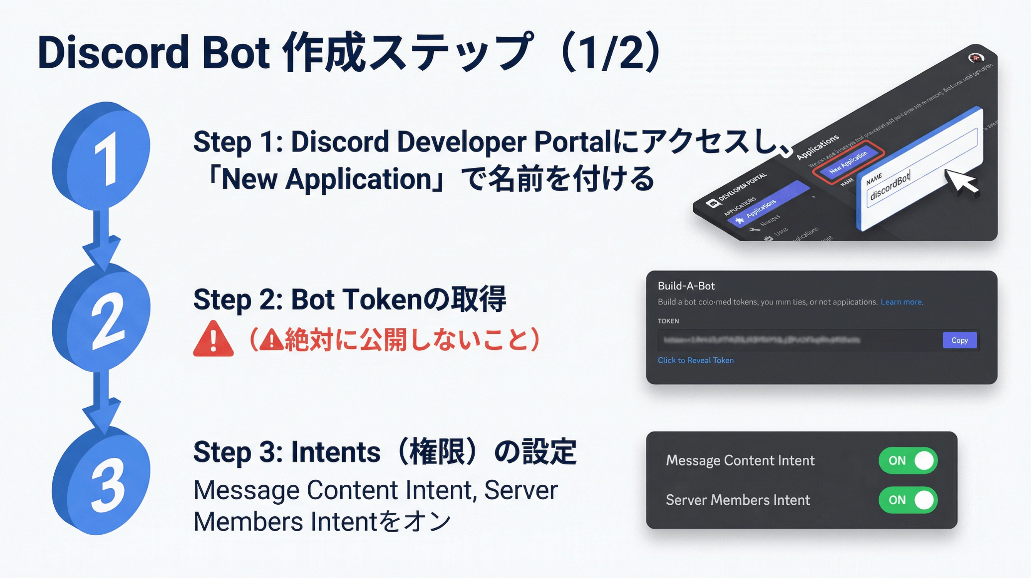 - Botトークンを絶対に他人に教えない:トークンが漏れるとBotが不正操作される危険がある