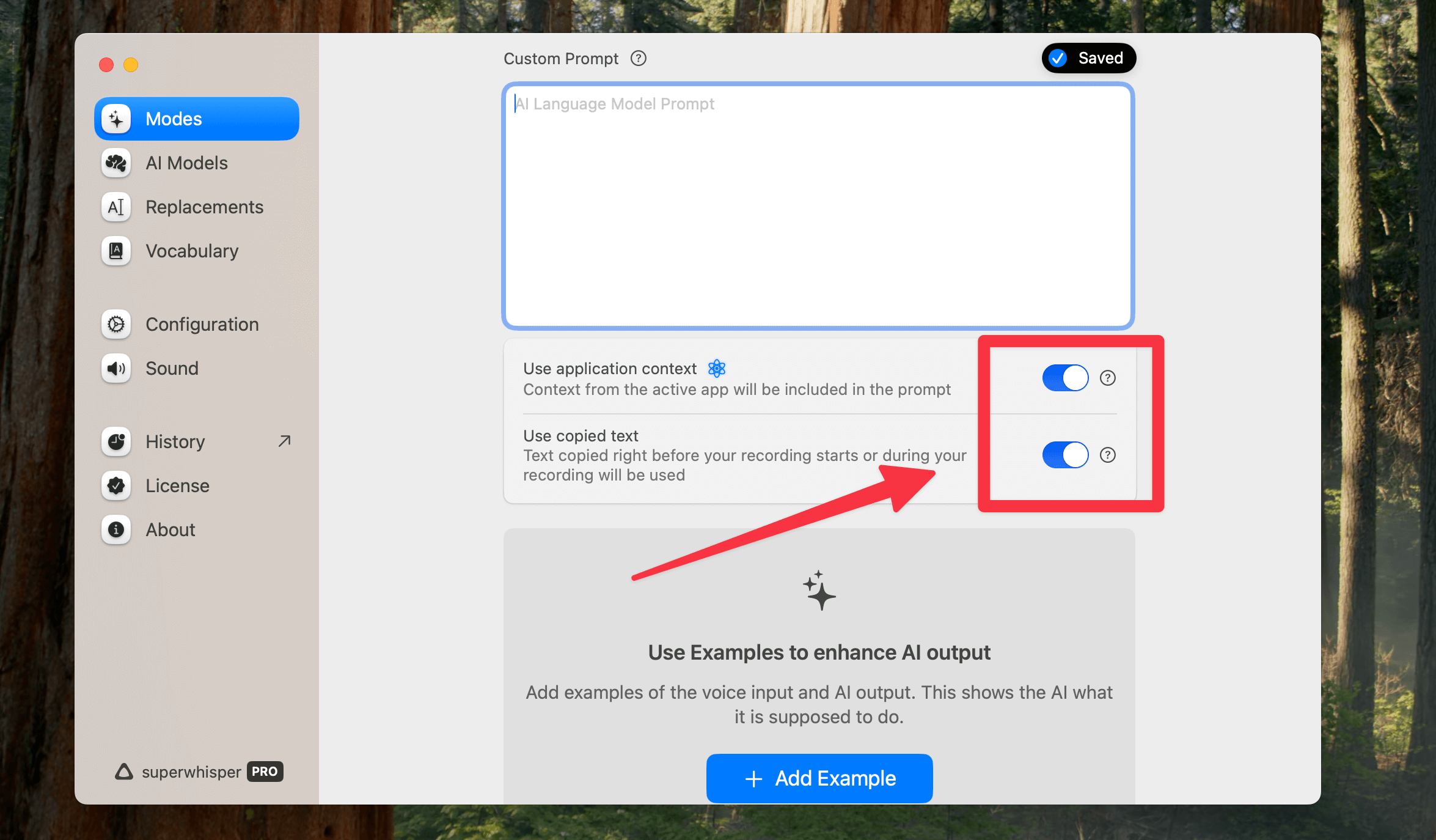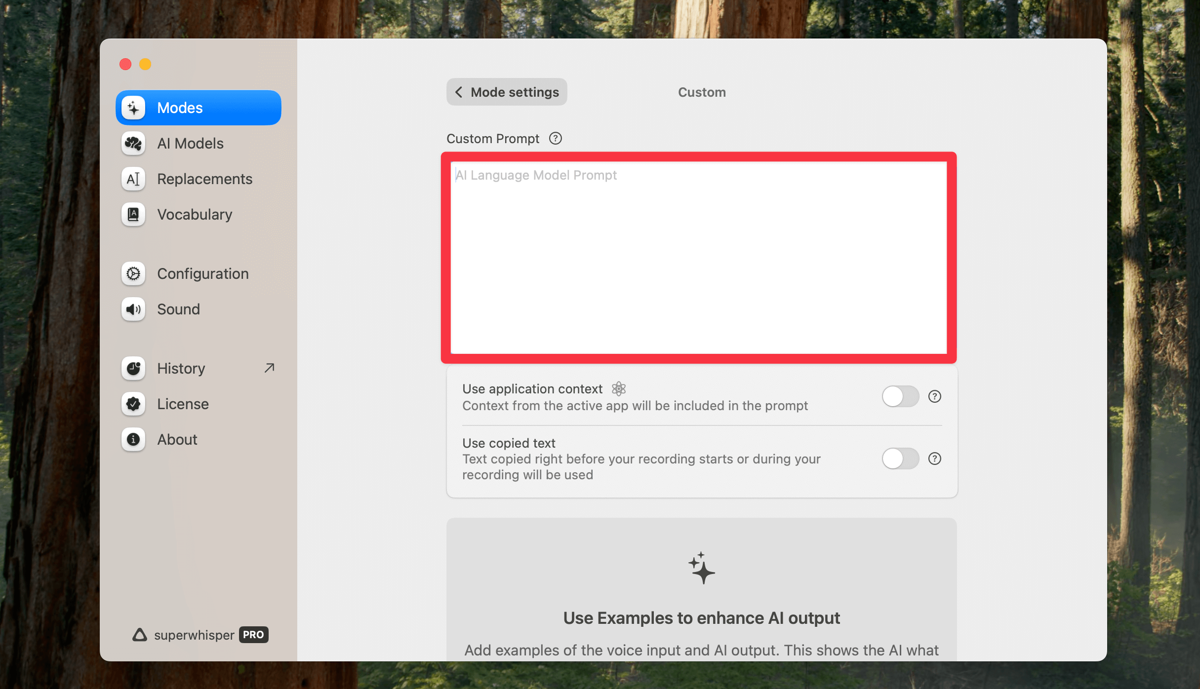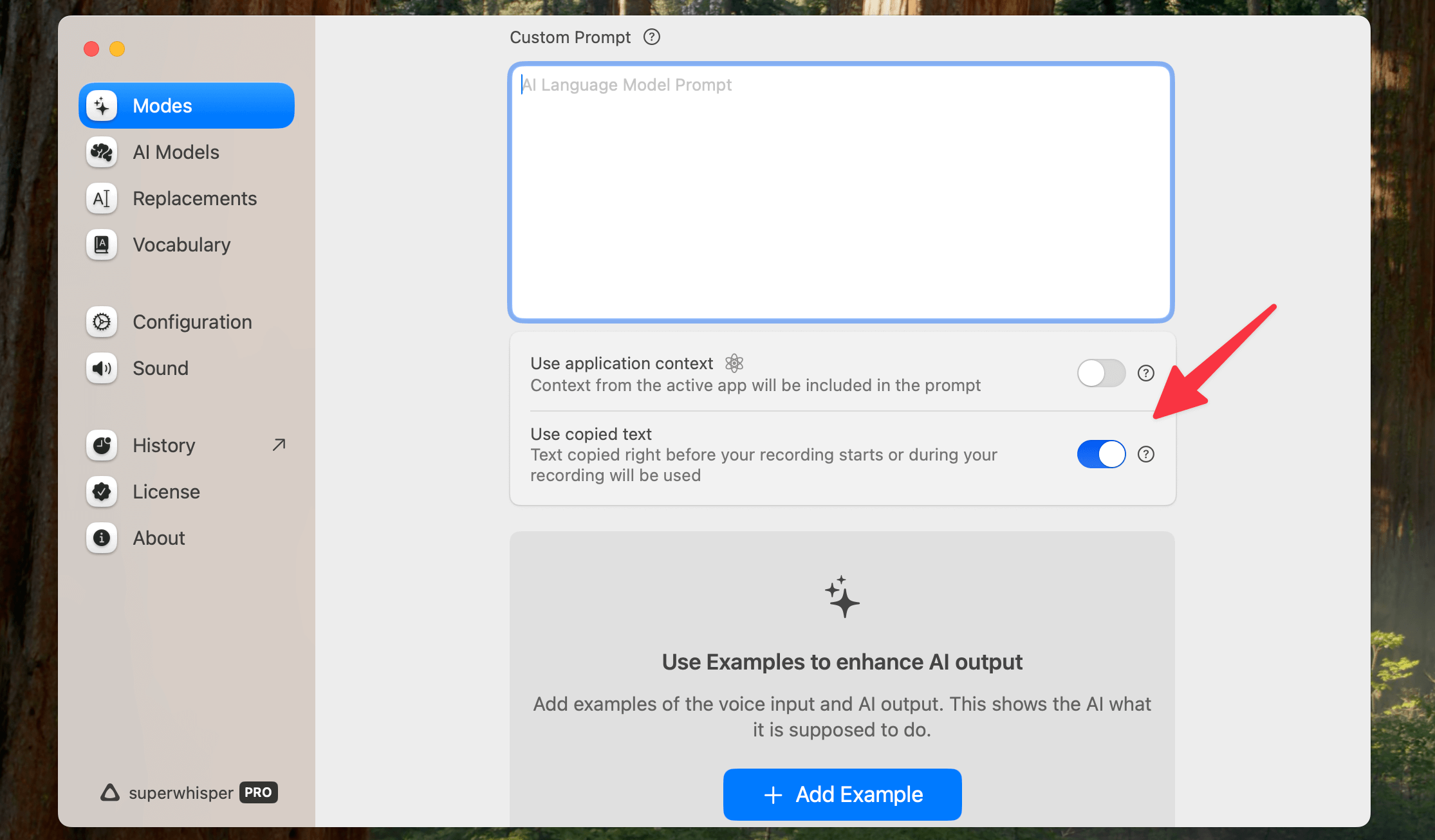 今回もカスタムモードを用いて、音声入力を効率的に行います。カスタムモードに「Use Copied Text」(コピーしたテキストを処理に含める)の機能をオンにしておき、以下のプロンプトを利用することで簡単にブログ生成機能が搭載されます。