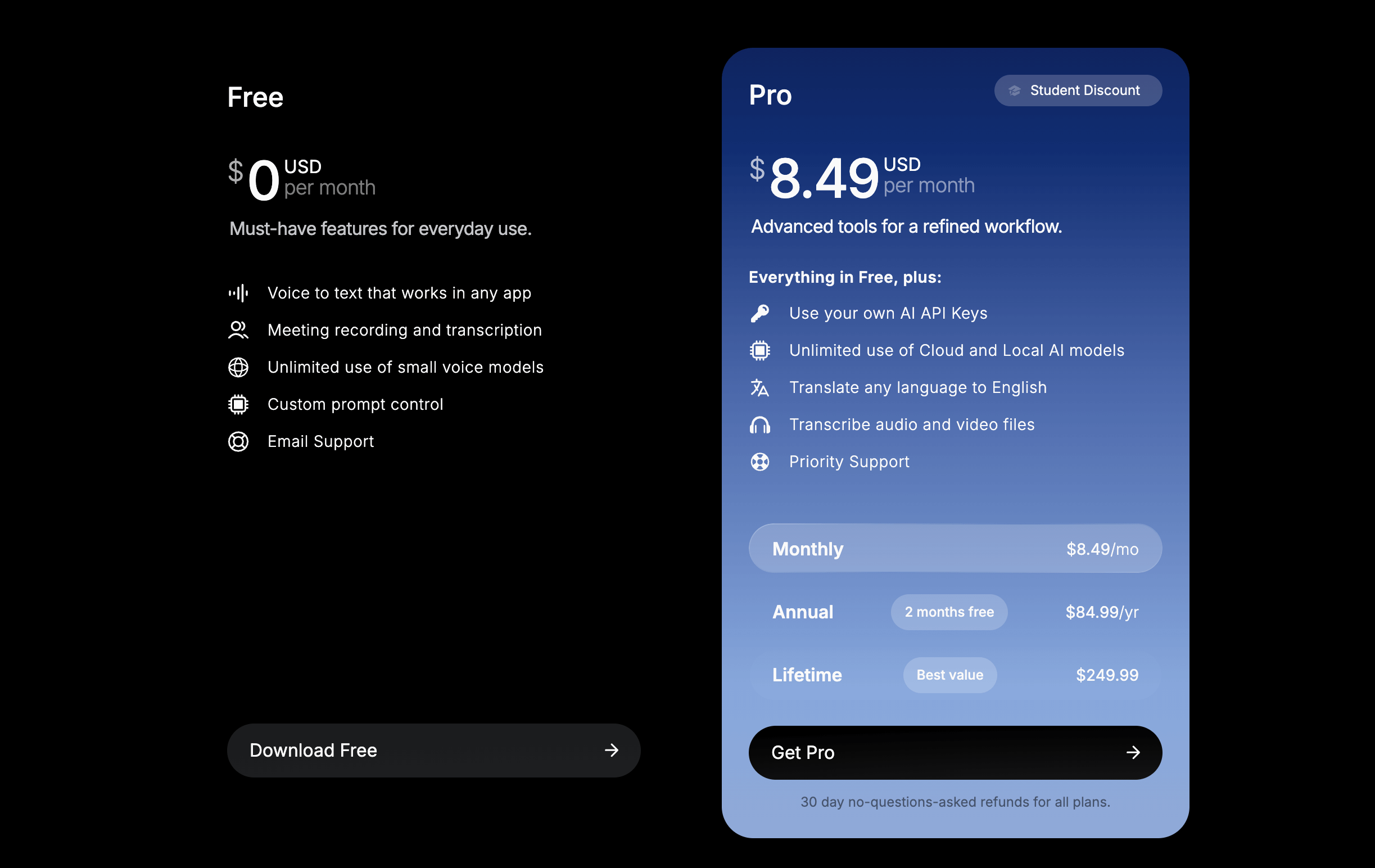 Pro版の料金プランは月額$8.49(約1,000〜1,200円)からで、年間プランや永久ライセンスも用意されています。学生向けには40%OFFの学割もあるため、学生の方には特におすすめです。無料版と比較して、特に日本語の変換精度が向上するほか、録音ファイルの一括文字起こしという実用的な機能が使えるようになります。