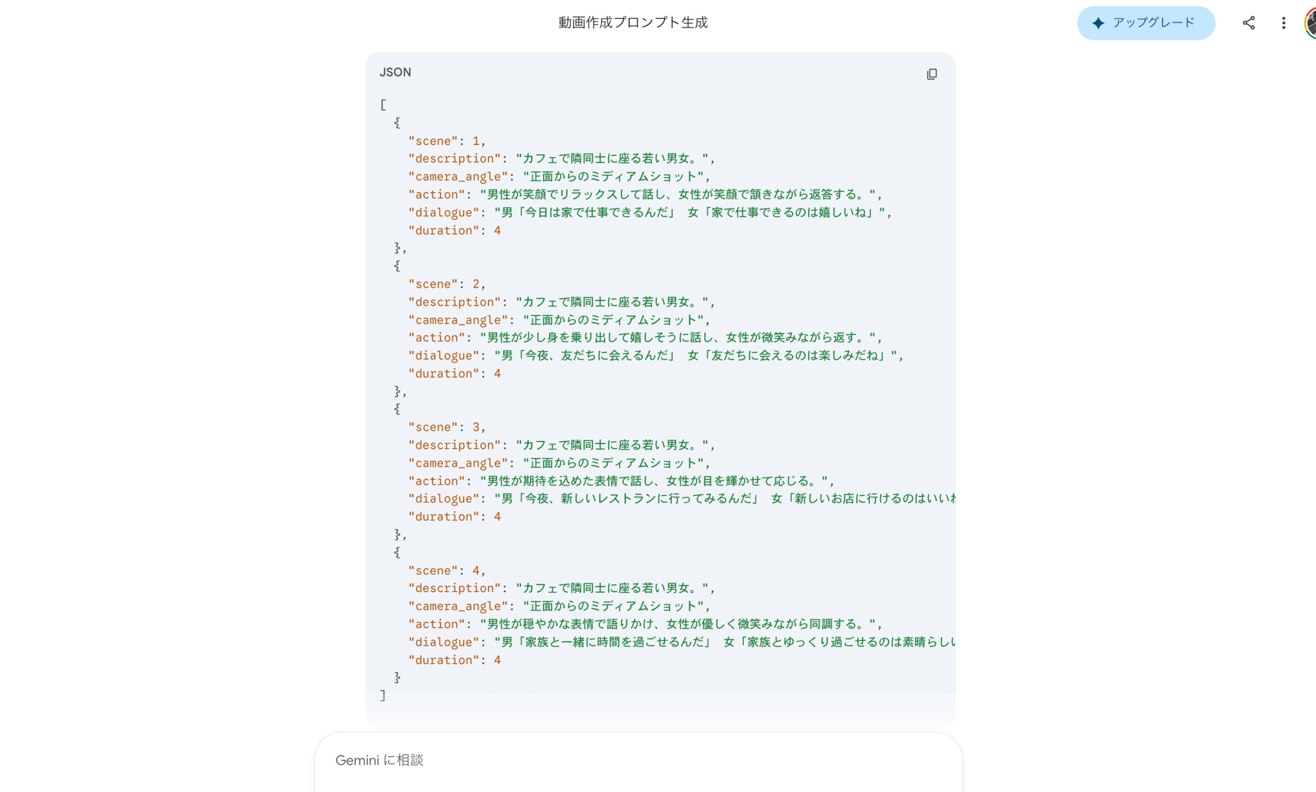 参考動画をGeminiなどの生成AIに投げて、動画の構成を分析してもらいます。どのようなプロンプトで動画を生成すればよいか、JSON形式で提案してくれます。