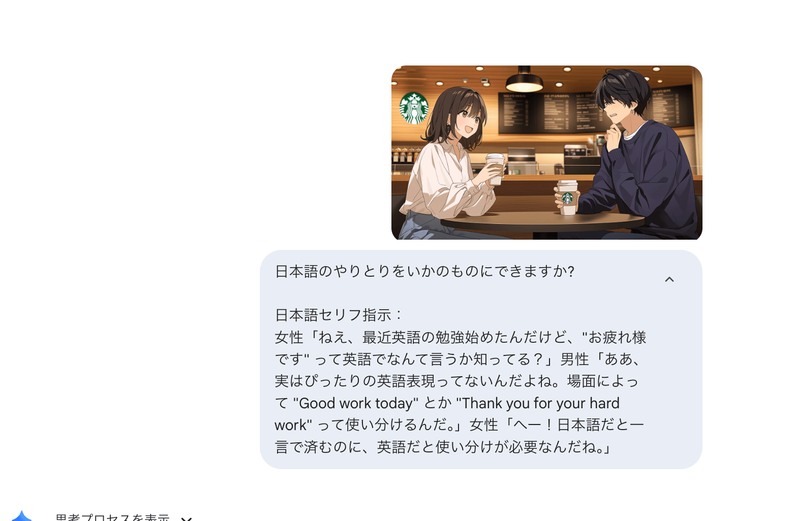 分析結果をベースに、キャラクターのやり取りを日本語で指定します。女性キャラクターと男性キャラクターのセリフをそれぞれプロンプトに記載してください。