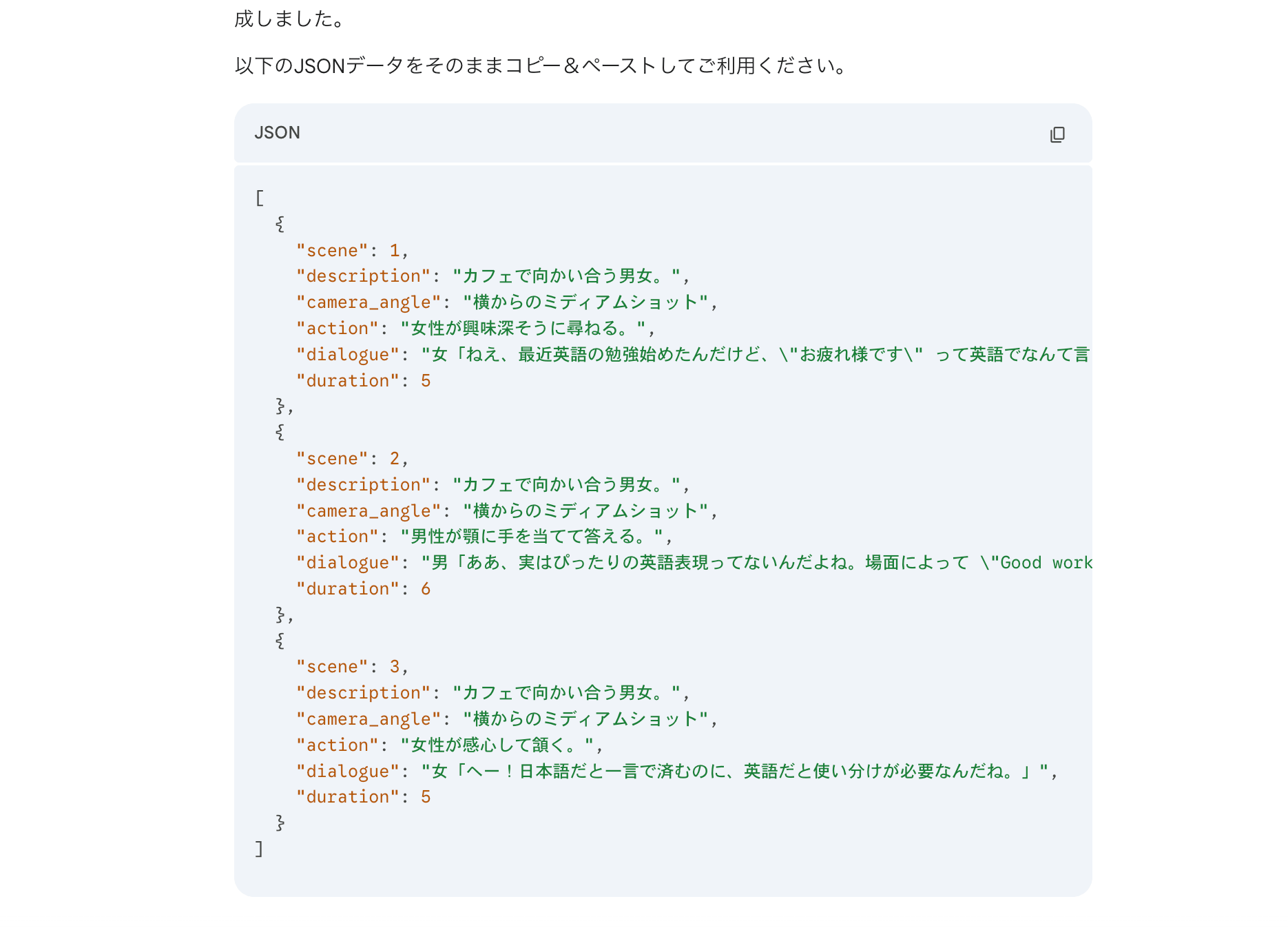 作、話す台詞、動画の長さ(秒)を含めてほしい。そのままコピー&ペーストすれば動画が生成