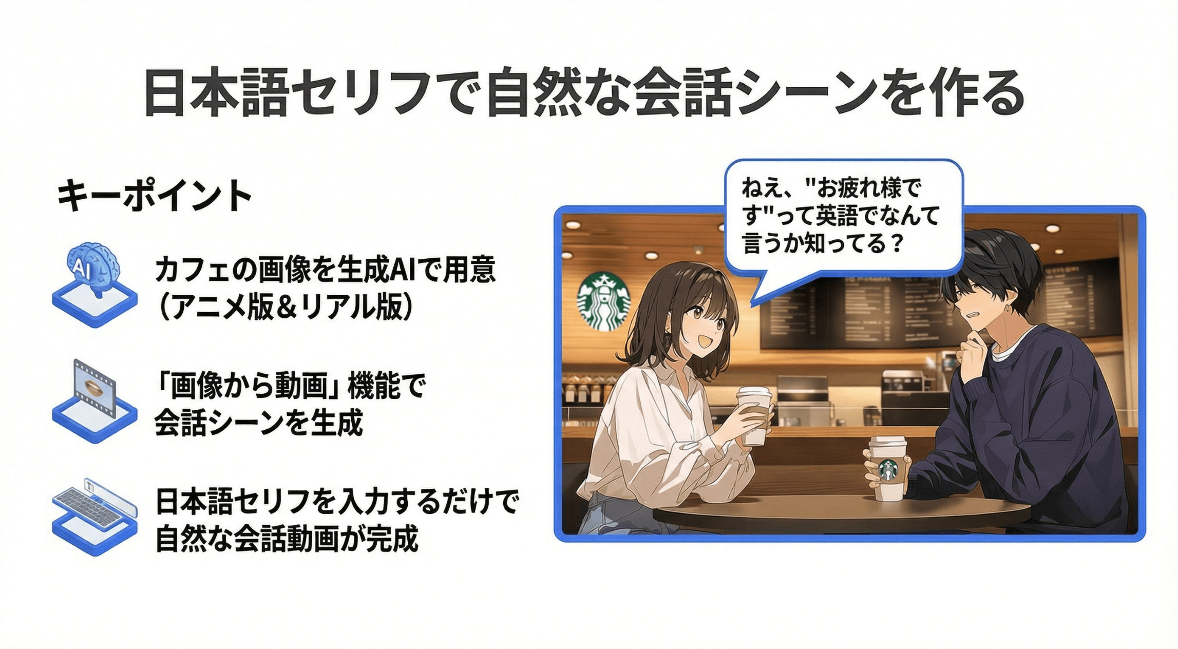 次に、2人のキャラクターが日本語で会話するアニメ動画の作り方を解説します。最近流行りの勉強系ショート動画のような、対話形式のコンテンツを作ることができます。