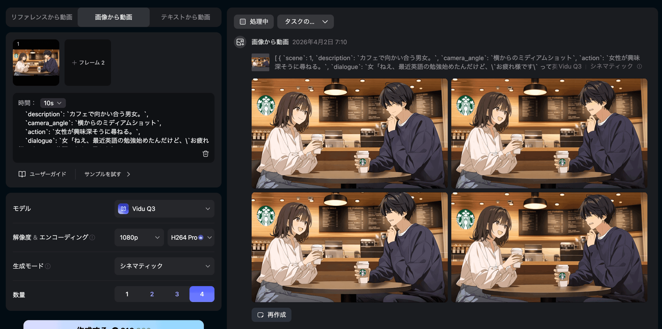 Vidu Q3でも、2人のキャラクターの会話を1本の動画で一発出しするのは難しい場合があります。セリフが詰まったり、言葉が途切れてしまうこともあります。