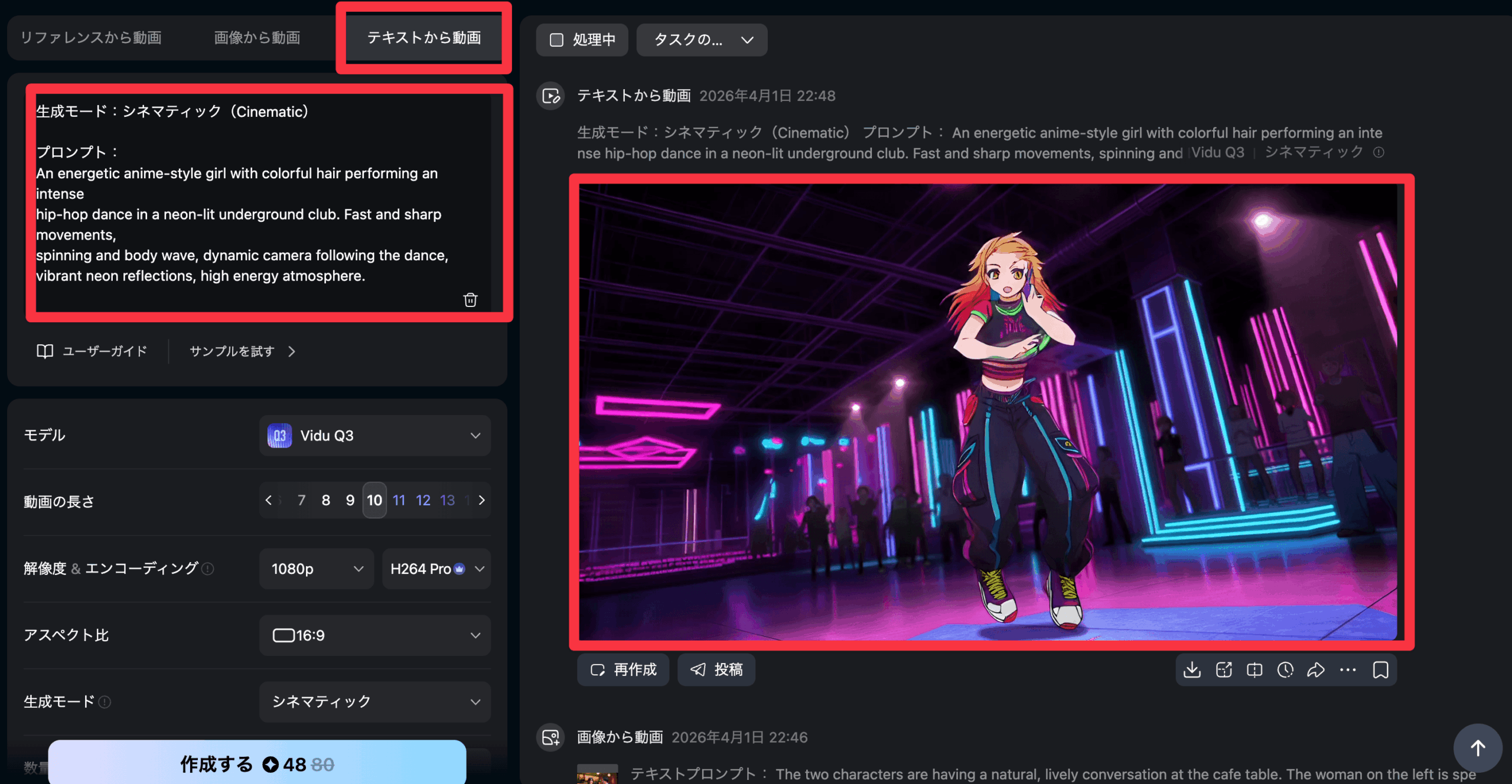 従来の動画生成AIでは、テキストのみで生成する動画のクオリティはかなり低いのが一般的でした。しかしVidu Q3では、テキストプロンプトだけでもリアルなアクションシーンやアニメキャラクターのダンス動画など、高品質な映像を生成することができます。