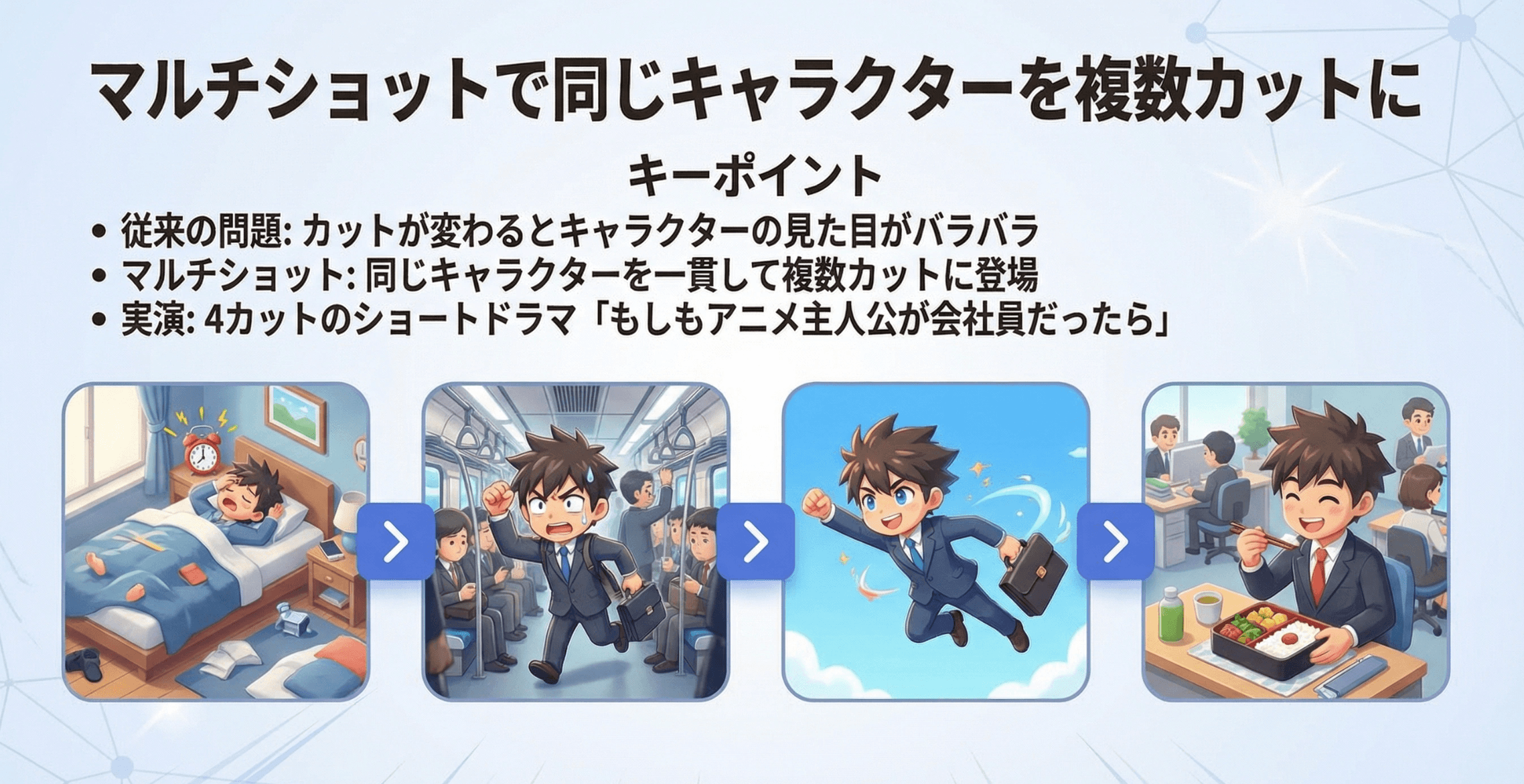 - マルチショットによるキャラクター一貫性の確保