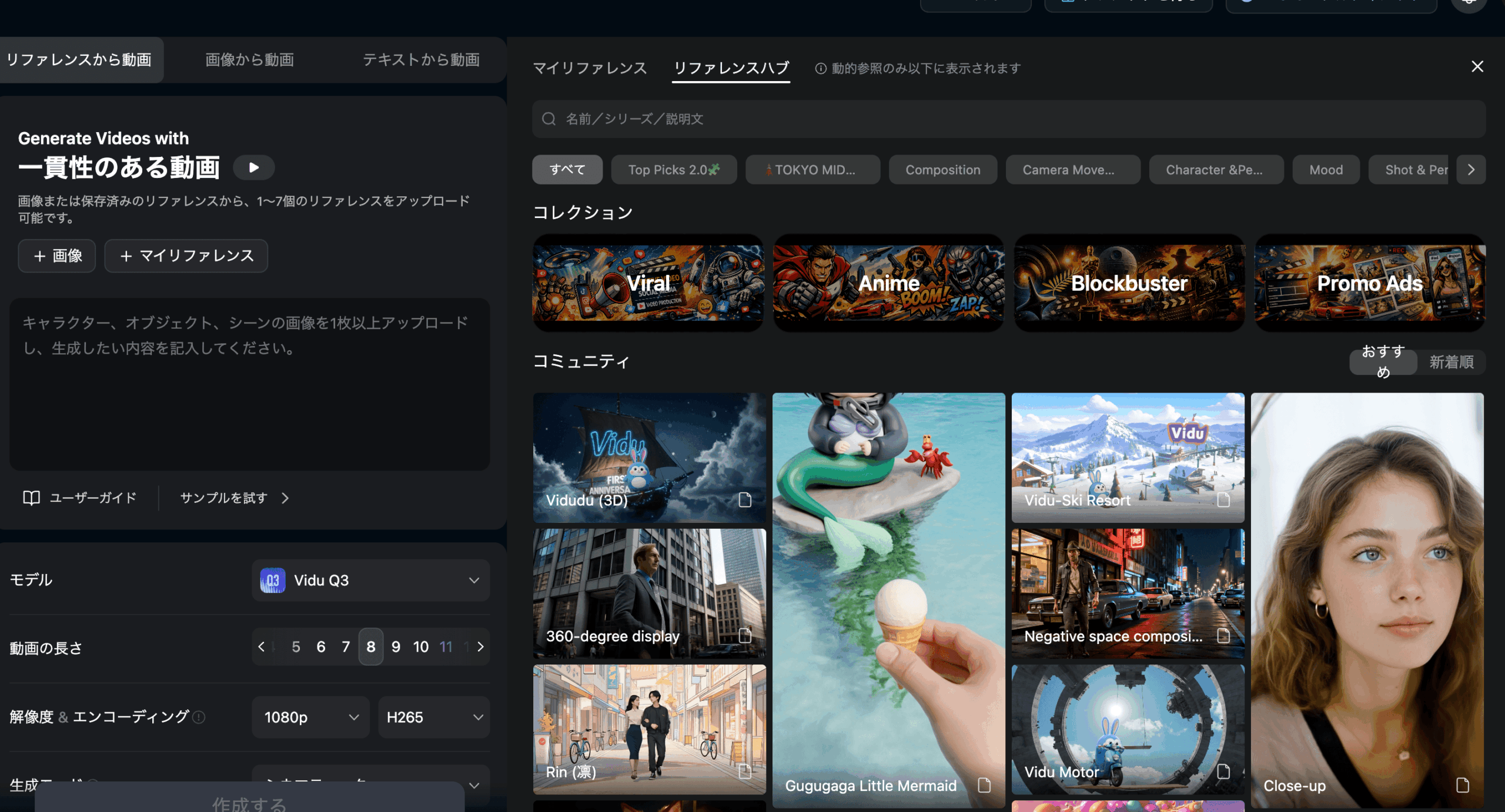 動画生成AIで長尺コンテンツを作る際に最大の課題となるのが、複数カットでキャラクターの外見を一貫させることです。Viduの「リファレンスから動画」機能を使えば、この問題を解決できます。